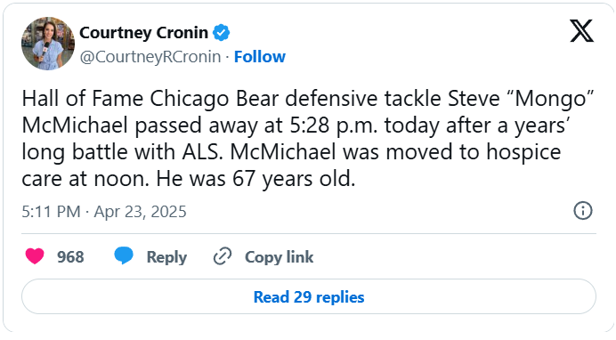 Following the news of his move to hospice care, Courtney Cronin has reported that Steve “Mongo” McMichael has passed away at the age of 67.