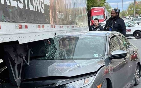 AEW timekeeper Brooklynn Ramsey posted a photo took Twitter, a Honda sedan stuck under the truck. Ramsey noted that the driver was ok, but also said not to text and drive.