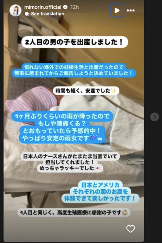 “A Japanese nurse was luckily on duty at that moment and was assigned to us! We were super lucky. We were able to experience the childbirth care of both Japan and America, which was fun! Just like with our first child, we are so grateful for the high-quality medical care here.”