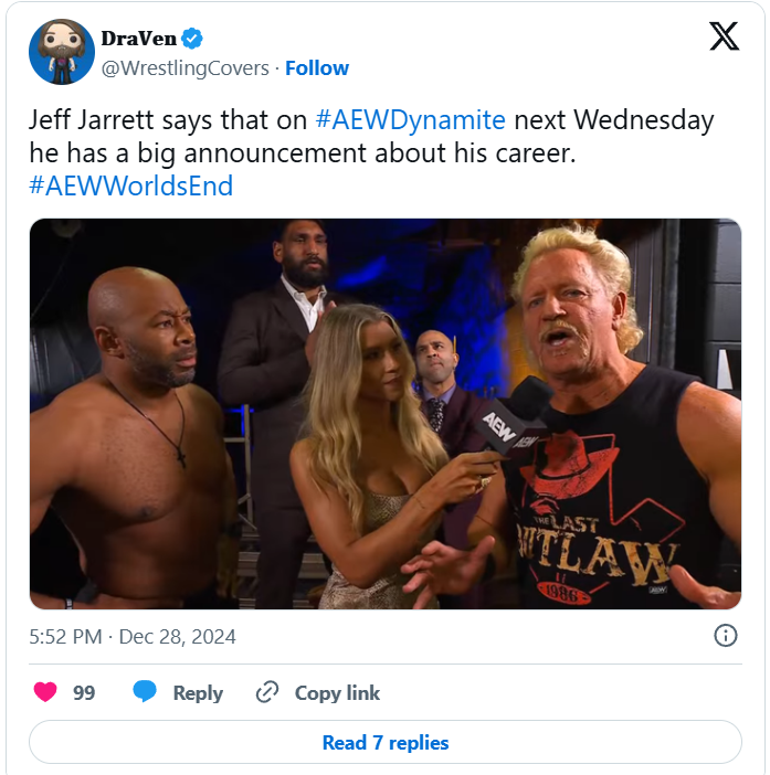 During Saturday night’s AEW Worlds End Zero Hour pre-show, Jeff Jarrett revealed during a backstage interview that he will make a big announcement about his career on the January 1, 2025 episode of Dynamite: Fight for the Fallen.