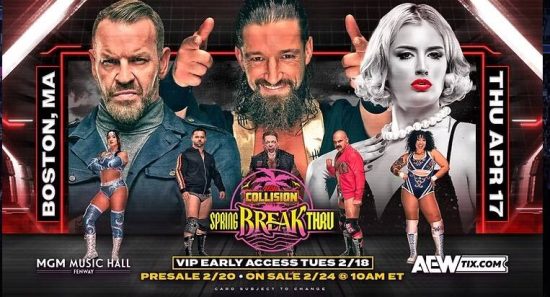 The special live Thursday episode of Collision will take place from the MGM Music Hall at Fenway in Boston, Massachusetts. AEW will also air a live episode of Dynamite from the same venue the night before on April 16.