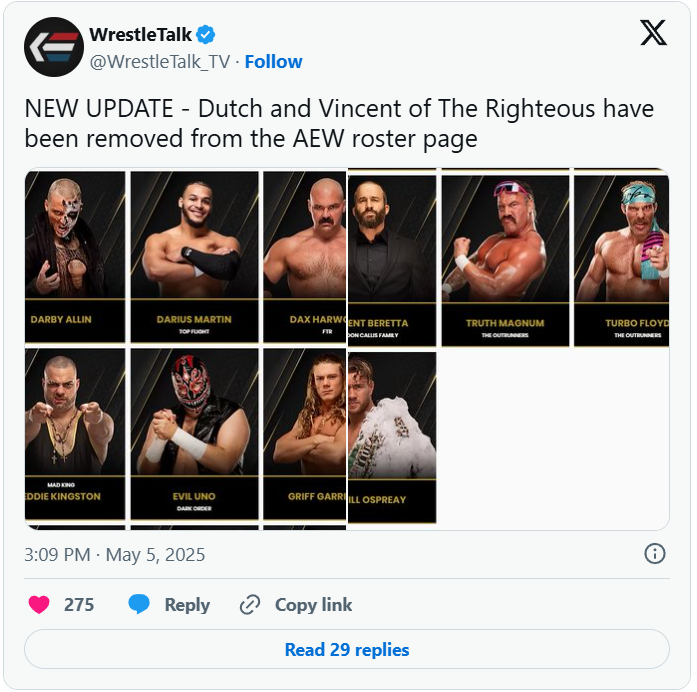 On Monday, several media outlets reported The Righteous, Vincent and Dutch no longer appearing on AEW’s roster page. This began speculation that the duo had left AEW and ROH.