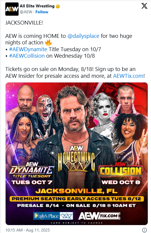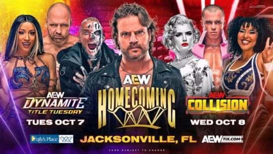 AEW returns to Daily’s Place in Jacksonville Florida for two Homecoming events. Dynamite Title Tuesday will take place on October 7, with a special Wednesday Collision taking place the next night, October 8.