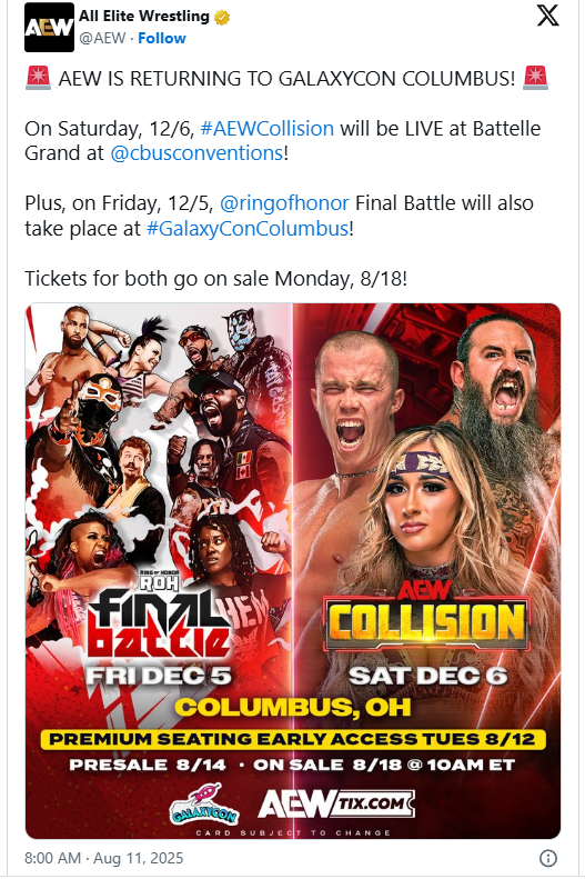 Tickets for both AEW Collision and Ring of Honor Final Battle at GalaxyCon Columbus will go on sale next Monday, August 18 at 10 AM ET via AEWTix.com and GalaxyConColumbus.com. Fans interested in early access presale opportunities can register to become an AEW Insider by visiting allelitewrestling.com/aew-insider.