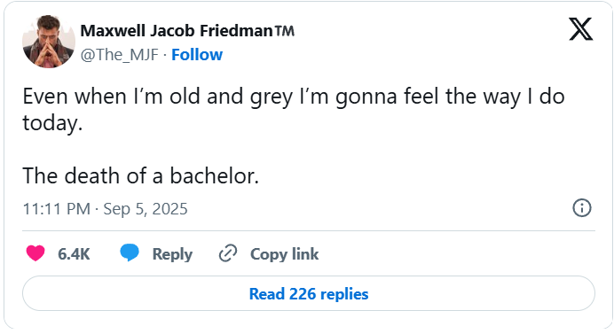 MJF also posted to social media, saying that even when he is old and grey he going to feel the way he does today. He closed out by saying it is the death to a bachelor.