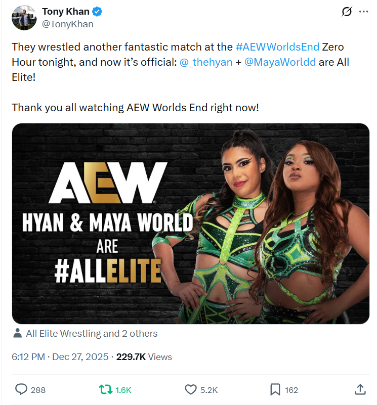 Tony Khan as confirmed Hyan and Maya World are officially All Elite, following their loss to the Sisters of Sin (Julia Hart and Skye Blue) at the Worlds End Zero Hour Saturday evening at NOW Arena in Hoffman Estates, Illinois.