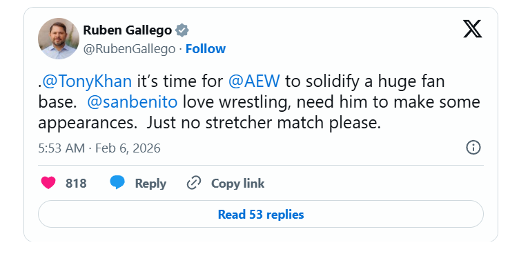 Current United States Democratic senator Ruben Gallego from Arizona took to social media and publicly called out AEW head Tony Khan to bring in Puerto Rican rapper, singer and record producer Bad Bunny to the company.