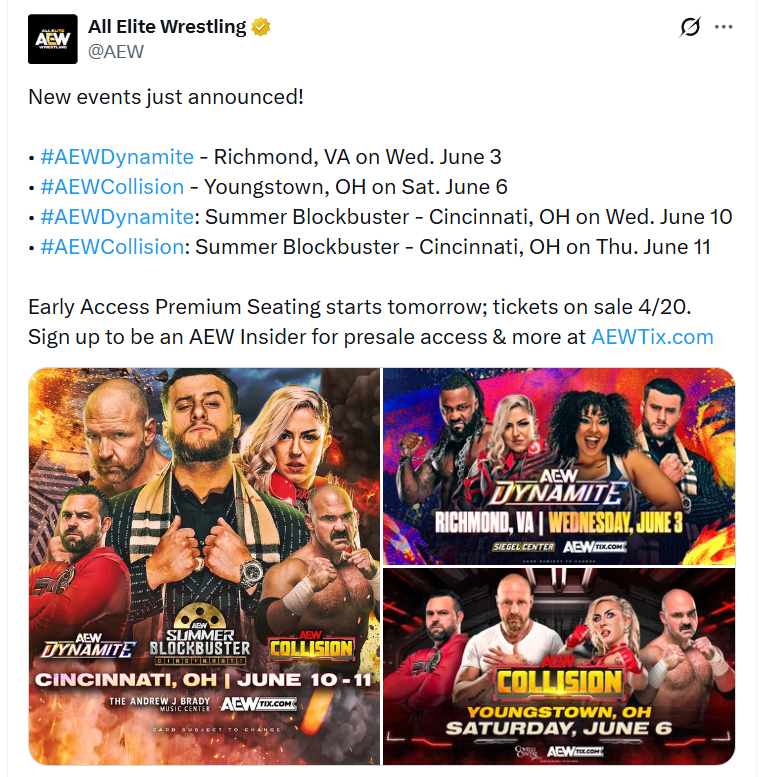 In addition, AEW has also announced Dynamite for June 3 at the Siegel Center in Richmond, Virginia and Collision on June 6 at the Covelli Center in Youngstown, Ohio.