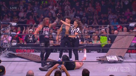The injury occurred during a Codebreaker with barbed wire wrapped chair that accidentally hit Jericho in the face. Jericho, with an assist from Sammy Guevara, hit the Judas Effect on Kingston to get the win.