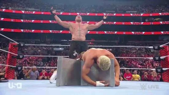 Lesnar knocks Rhodes out of the ring and sends him into the barricade. Lesnar suplexes him into the timekeeper’s area. Lesnar goes into the timekeeper’s area and smashes a chair on Rhodes’s back. Lesnar is fired up and grabs the top half of the steel ring steps. Rhodes stumbles out of the timekeeper’s area and takes the steel steps to the side of the body and head. Lesnar throws the steps into the ring. Lesnar grabs Rhodes and gives him an F-5 through the commentary table! Lesnar lets out a primal scream. Lesnar threatens Adam Pearce and other officials that try to help.