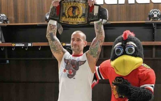 CM Punk, who returned to AEW at the premiere episode Collision last Saturday night, was recently gifted a Chicago Blackhawks a Championship Belt by the team’s mascot Tommy Hawk