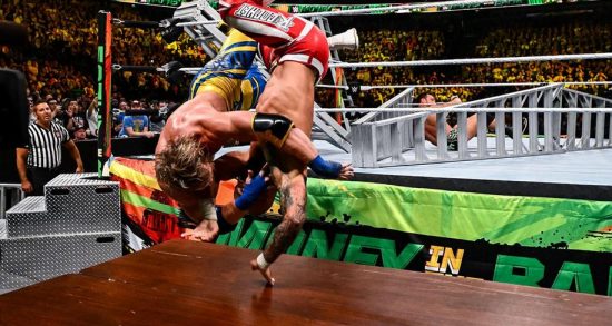 During a point in the WWE Men’s Money in the Bank Match, Logan Paul and Ricochet were fighting each other up high on a ladder, until LA Knight pushed it over. Both men (Paul and Ricochet) landed on the top rope and then improvised by doing a botched Spanish Fly to crash through a table that was set up on the floor. As a result of the move, Paul hit his face on the table, which then brought over WWE Officials to immediately check on him. At this point in the match, Paul and Ricochet were not seen any further.