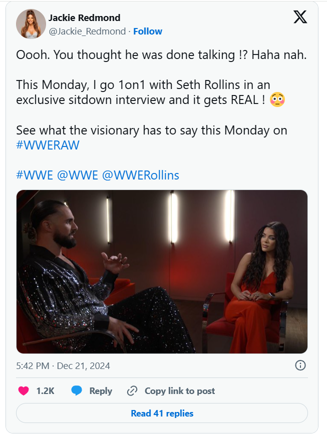 WWE’s Jackie Redmond announced on X, that she will conduct a sit-down interview with Seth Rollins on this Monday’s episode of Raw.