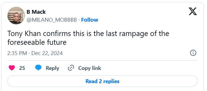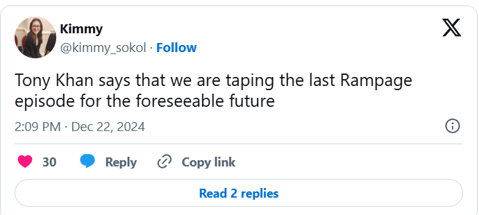 During Sunday night’s AEW Dynamite and Rampage taping at the Hammerstein Ballroom in Manhattan, New York, fans are reporting Tony Khan has confirmed that the Rampage taping will be the last one for the “foreseeable future.”