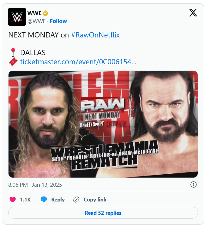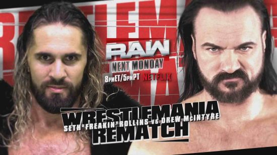 Next Monday’s WWE Raw will see a WrestleMania 40 rematch with Seth Rollins and Drew McIntrye squaring off.
