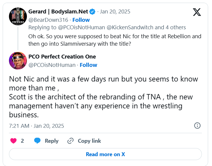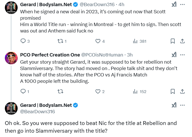 PCO also responded to Gerard from BodySlam.Net regarding a promised TNA World Championship run by Scott D’Amore.