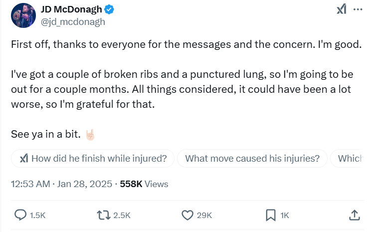 WWE’s JD McDonagh posted to social media that he be out of action for a couple of months due to broken ribs and a punctured lung he suffered during the World Tag Team Title Match on Monday’s Raw.