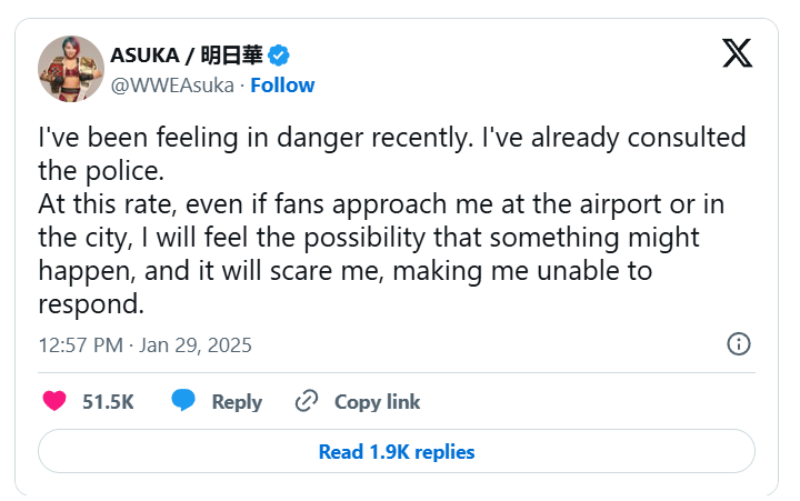 Asuka took to social media to follow up on her recent statement where she addressed concerns regarding scary fan interactions, with social media posts stating not to have “romantic feelings” for her and noting she had consulted authorities after “feeling in danger” due to a recent incident.