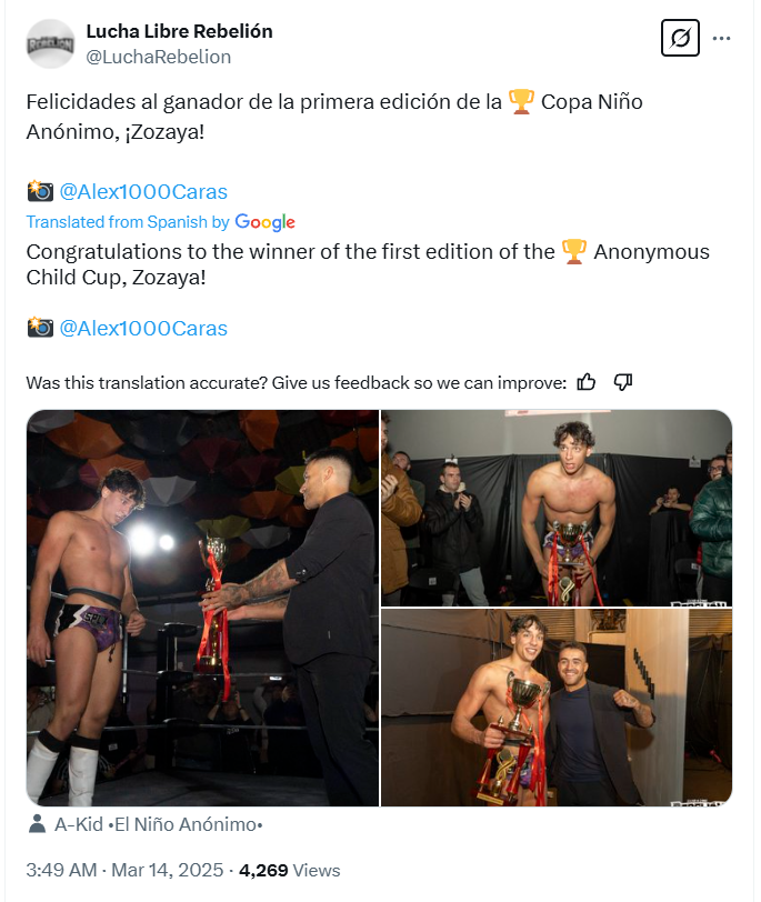 In Spain, he is formerly competed as A-Kid/Nino Anonimo. He came out (unmasked) during the AAA Lucha Libre Rebelion event and presented the first-ever Nino Anonimo Cup to local wrestler Zozaya.