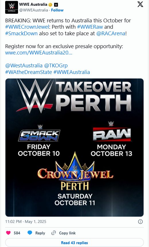 The October 10 episode of SmackDown and the October 13 episode of Raw will also take place from Perth at the same venue.