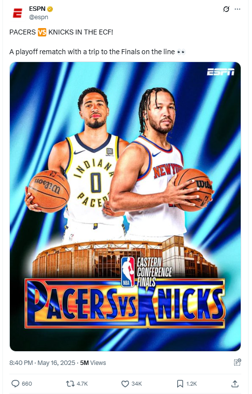 ESPN posted a graphic looking ahead to the NBA Eastern Conference Finals between the Indiana Pacers and New York Knicks that may look familiar to WWE fans.