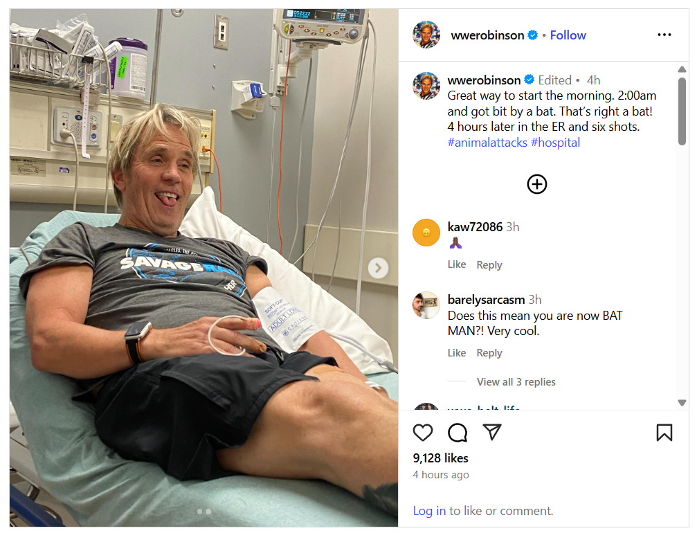 “Great way to start the morning. 2:00am and got bit by a bat,” Robinson wrote. “That’s right a bat! 4 hours later in the ER and six shots. #animalattacks #hospital”