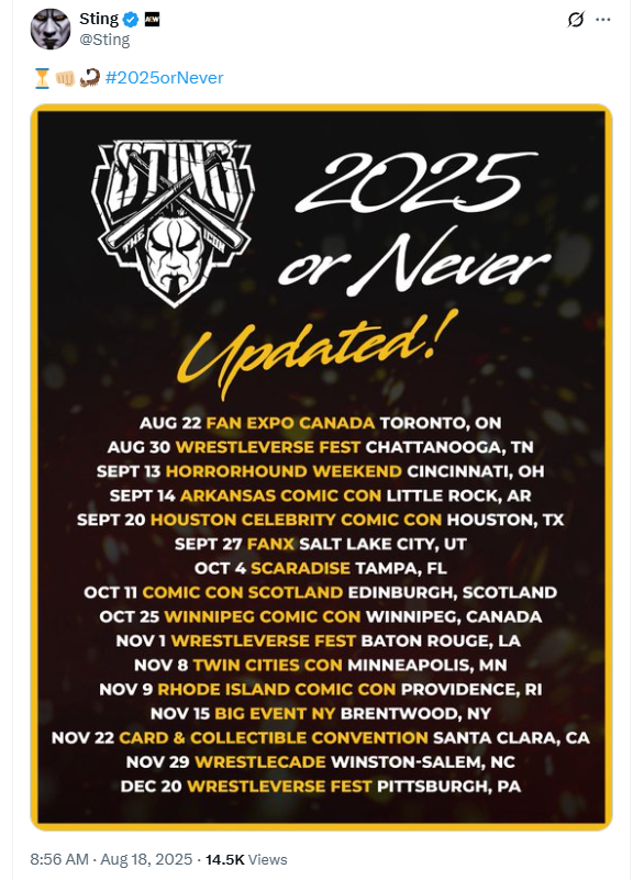 Sting has announced the final dates of his 2025 or Never convention tour, his final set of appearances in full makeup.