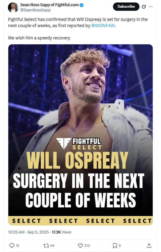 As first reported by F4WOnline, then confirmed by Fightful Select, AEW’s Will Ospreay is set to undergo neck surgery in the next couple of weeks.
