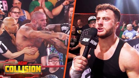 During Saturday night’s live episode of AEW Collision, newly married AEW star MJF made a surprise appearance on the show, spoiling a future TNT Championship opportunity for Mark Briscoe. If Briscoe had defeated Konsuke Takeshita, he would have then be next in line to challenge Kyle Fletcher for the TNT Title.