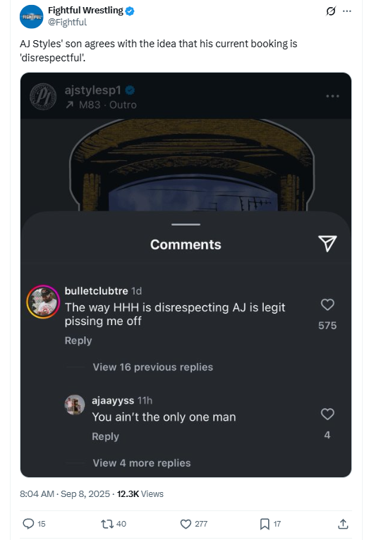 The son of AJ Styles has responded to a post on social media from a fan stating that Triple H’s current booking of his dad is disrespectful.
