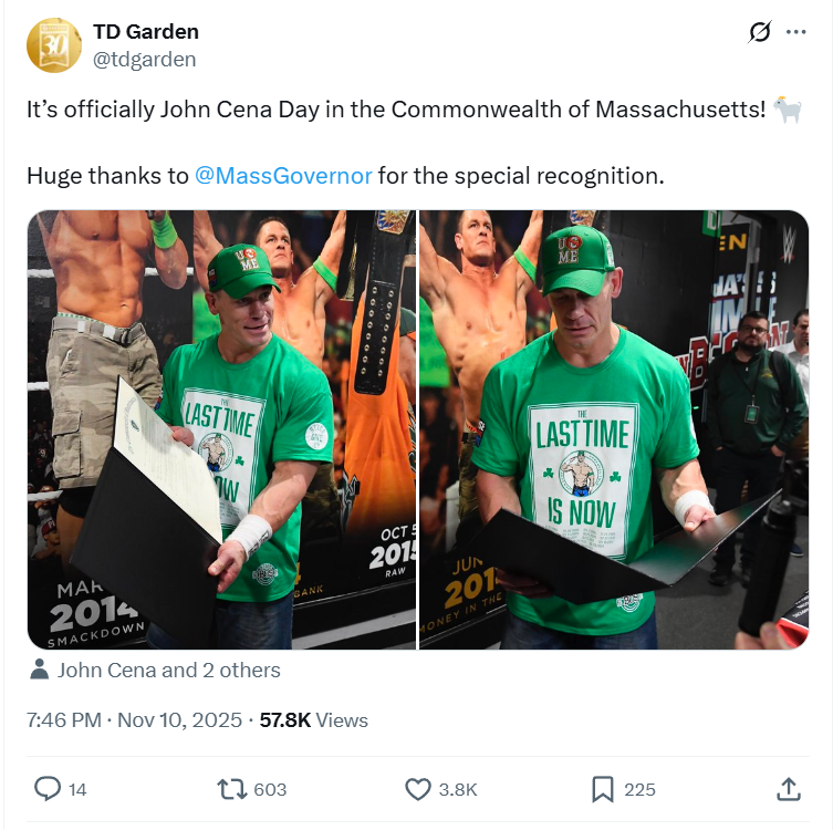 Following his appearance on Monday’s WWE Raw at TD Garden in Boston, which included capturing the Intercontinental Championship from Dominik Mysterio, the Commonwealth of Massachusetts has declared November 10 as John Cena Day.
