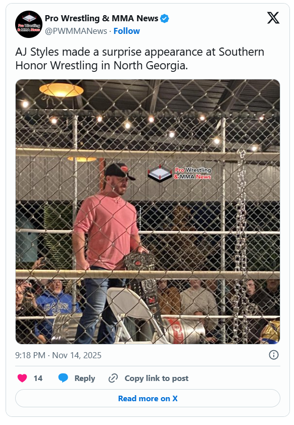 Fan reports say Styles appeared following the main event steel cage match, where Alexander Lev won the Southern Honor Wrestling Title using the Styles Clash.