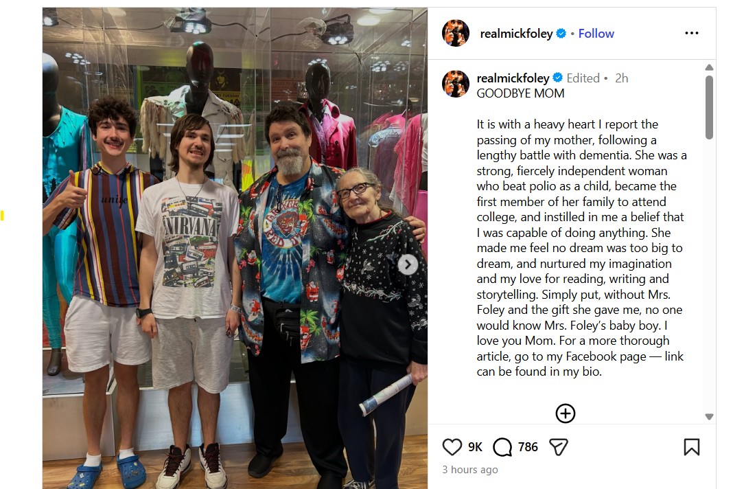 In a lengthy Facebook post, Foley noted that his mother was a private person and with her not wanting a funeral or an obituary, he instead wrote a tribute to her with his intent and hope it would be a way to help those who have family members suffering from dementia.