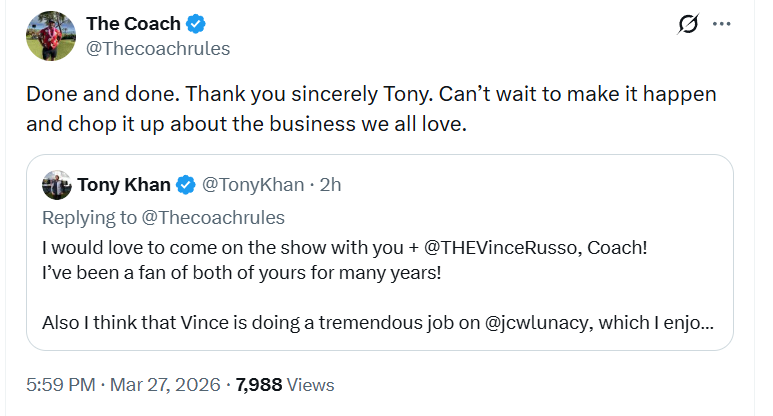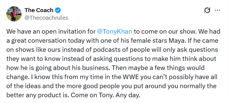 Coachman also posted to X, that he and Russo have an open invitation for Khan to be a guest on their podcast. Khan then responded by saying he would love to come on their show, as he has been a fan of Russo and Coachman for years. Coachman, replied back telling Khan, “Done and done. Thank you sincerely Tony. Can’t wait to make it happen and chop it up about the business we all love.”