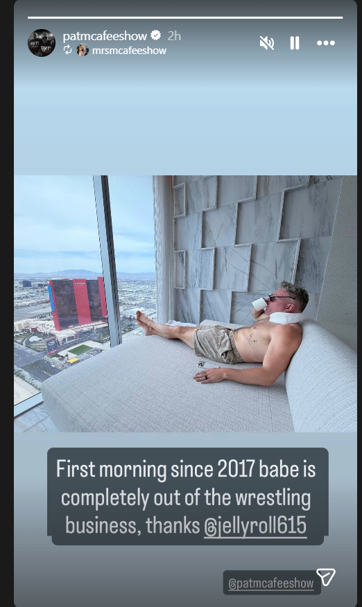 McAfee’s wife took to Instagram Stories posting a photo of Pat sitting on a bed, wearing a neck brace while drinking a beverage with the caption under the photo that reads: “The first morning since 2017 that babe is completely out of the wrestling business. Thanks Jelly Roll.”