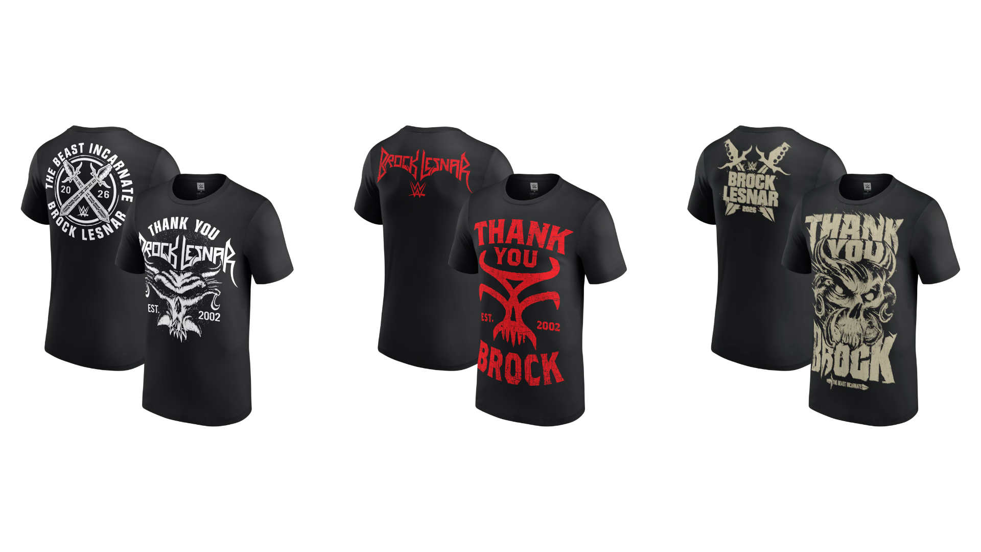 Three different shirts featuring the message “Thank You Brock” and variations on logos and designs related to The Beast are on display on the WWE Shop website with the following description: