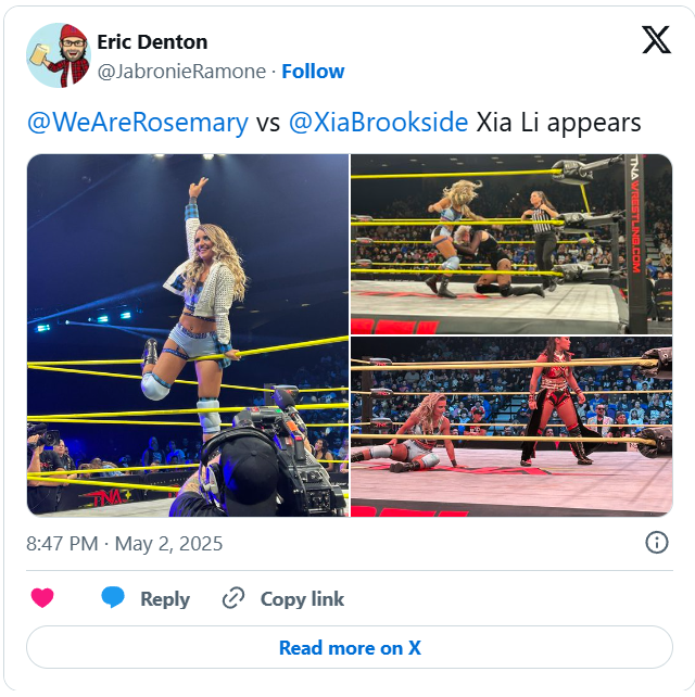 -Rosemary vs. Xia Brookside ended in a DQ. Xia Li made the save on Brookside. Double Xias!
