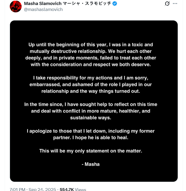TNA Masha Slamovich took to X on Wednesday, issuing a statement on the recent domestic violence allegations, which were made public on social media on Tuesday by a friend of her former partner, independent wrestler AKIRA.