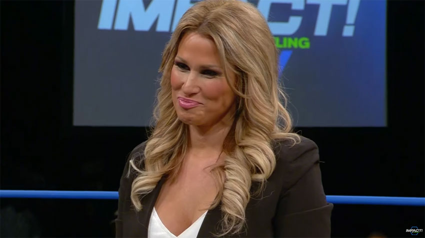 In the Impact Zone, Borash says his guest was integrel to Impact Wrestling making it as far as it has today. That woman is Karen Jarrett. She signs an autograph for a fan and hugs a kid who looks uninterested. Mathews looks bored. The crowd chants “Welcome back!”