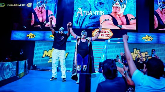 Harris joined famed CMLL star Atlantis in the ring after being given a mask, to a big reception from the crowd before later posing with Atlantis and a referee.