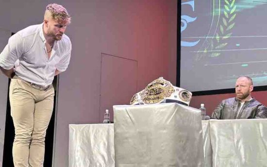 During the NJPW Wrestle Kingdom 18 press conference on Wednesday, Ospreay and Moxley agreed to ‘a ceasefire’ in the opening five minutes of the three-way title match to take out Finlay, so then they can give the fans what they really want to see, which is a singles match between Ospreay and Moxley. Ospreay even gave Moxley non-alcoholic beer as part of the deal.
