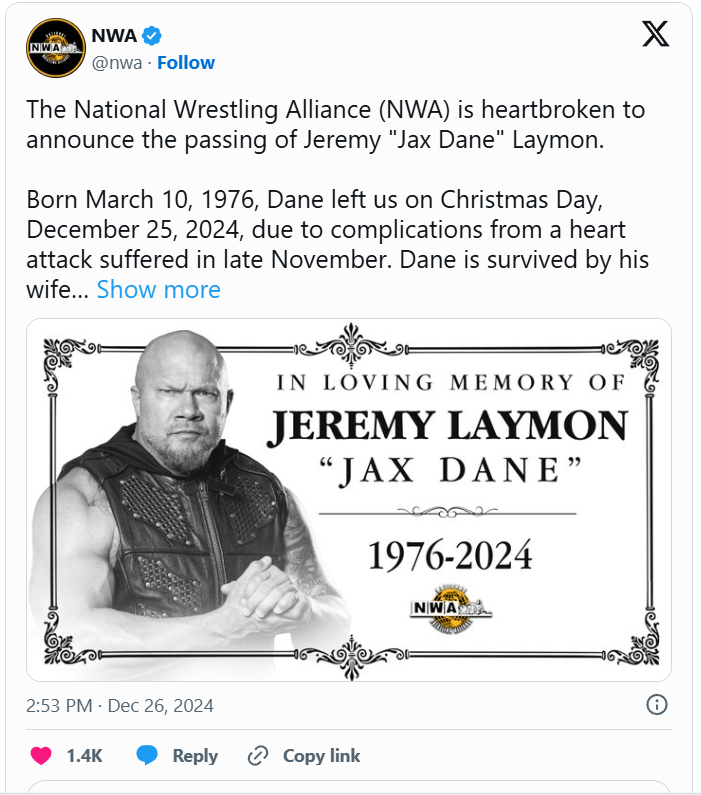 “The National Wrestling Alliance (NWA) is heartbroken to announce the passing of Jeremy “Jax Dane” Laymon. Born March 10, 1976, Dane left us on Christmas Day, December 25, 2024, due to complications from a heart attack suffered in late November. Dane is survived by his wife Evelynda Laymon, stepson Nicolas, and father, who will forever cherish his memory. He was 48 years old. Jax is remembered not only for his remarkable achievements inside the ring but his unwavering dedication to the sport and his fellow wrestlers. The most decorated wrestler of the Lightning One Era and former NWA World’s Heavyweight Champion, Jax left an indelible mark on the NWA and the pro wrestling community as a whole. Describing Dane as a “friend, mentor, absolute professional in and out of the ring, and loyalist who went out of his way to support and rebuild the NWA of today,” William Patrick Corgan expressed his sorrow, “Jax Dane loved professional wrestling deeply and he certainly loved those he fought and rode with. I know I speak for all of the National Wrestling Alliance when saying Jax will be missed. We will do our best to honor him and make his family proud as we carry forth,” the NWA’s President and Owner states. “There are those men and women who carry the legacy of a champion because they have risen to such heights,” Corgan continues, “And then there are those that earn the respect of a champion simply because of who they are. To this I can say, simply and personally, that Jax was such a man, and will forever be in our hearts.”