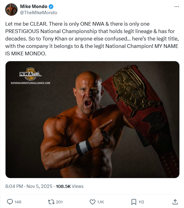“Let me be CLEAR. There is only ONE NWA & there is only one PRESTIGIOUS National Championship that holds legit lineage & has for decades. So to Tony Khan or anyone else confused… here’s the legit title, with the company it belongs to & the legit National Champion! MY NAME IS MIKE MONDO.”