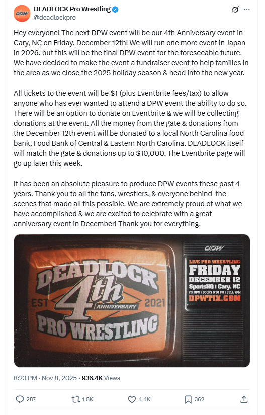 Independent promotion Deadlock Pro Wrestling announced on social media, the promotion’s 4th Anniversary show at the SportHQ on December 12 in Cary, North Carolina will be the last for “the foreseeable future.” There was no reason given as to why this is set to be DPW final show at the present time.