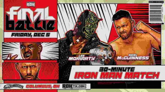 During the Ring of Honor Black Friday show on HonorClub, AEW color-commentator Nigel McGuinness appeared backstage, challenging ROH Pure Champion Lee Moriarty to a non-title 30-minute Iron Man Match at Final Battle.