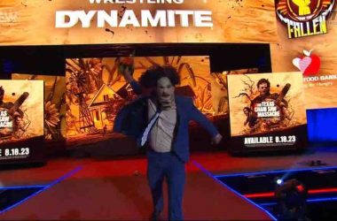 01 min AEW News Leatherface appears on AEW Dynamite, chases off Karen Jarrett Leatherface made a special cameo on Wednesday night’s AEW Dynamite, live from the Bridgestone Arena in Nashville, TN.… Jerome WilenAugust 16, 2023 Read More