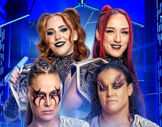 Ronda gets on the microphone and asks Raquel what she is doing there in the first place. Raquel says she wants a rematch for the titles that “we never lost” as Shayna asks who “we is”. Out comes Liv Morgan as both teams are face to face.