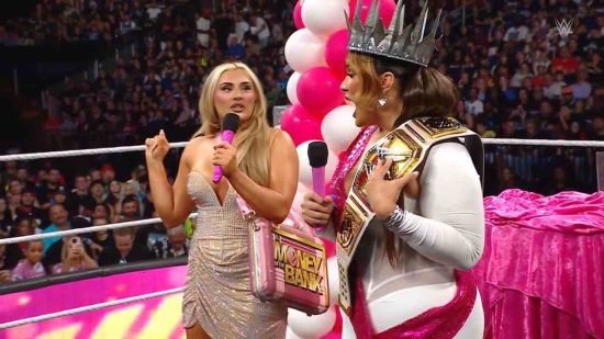 Tiffany Stratton and Pretty Deadly are in the ring. There are pink and white balloons in the ring. She introduces the new WWE Women’s Champion Nia Jax.