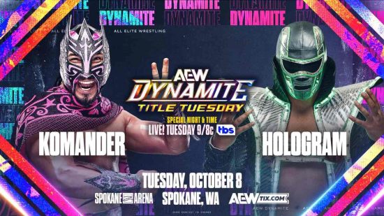 The two go back at it again, with Komander not quite getting all of a reverse rana on Hologram…and this gives the latter an opening to fend him off before heading to the corner. Komander takes to the ropes only to be set up for the airplane spin into a powerbomb, getting Hologram a big win here on Dynamite!