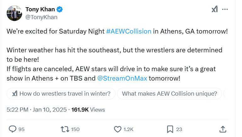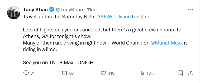 AEW’s Tony Khan took to social media on Friday noting tonight’s show would proceed. Khan then provided a travel update on Saturday, confirming that many of the talent are driving to the venue, with AEW Women’s World Champion Mariah May riding in a limo.